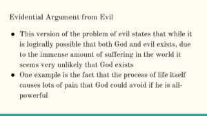 And traditionally, the one that is attacked first is the first premise — that because God is perfect and all-powerful, he can create a world in which there is no evil or suffering.