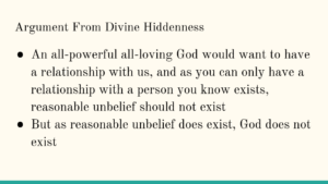 The issue of divine hiddenness is that if God is all-powerful and all-loving, then he would make his existence very obvious to us, so that we can enter into a relationship with him. It’s kind of hard to enter into a relationship with a person that you don’t know about, exactly.