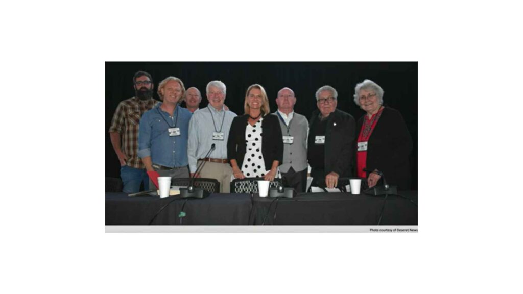 Steve: This is up at Park City, a little panel discussion. On the left is Jared Hess and Tyler Meeson, bald guy in the background is Rick Turley, Kirk Bench, Barbara Brown, Shannon Flynn, Jeff Johnson, and then Sandra Tanner on the far side.