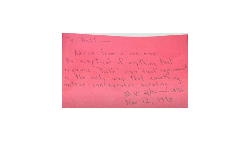 But one of the aspects through the whole investigation is that a lot of people saw things. Sometimes he’d buy a document, somebody says, “I don’t think it’s real,” and then he’d buy it back for more money, kind of double-deal on that one. He would bounce checks. He had a lot of checks that you could hear all around the world bouncing. But as Brent Ashworth, one of his victims, said to me one time, “I really didn’t like the man, but I needed him because he gave me what I wanted.” And if you don’t know who Brent Ashworth is, he’s an attorney who lives down here. Great collection of documents; he has a little bookstore downtown Provo, knowing Mormon stuff, Americana. And another person that we can talk later who suffered, was a victim of this, besides the documents.