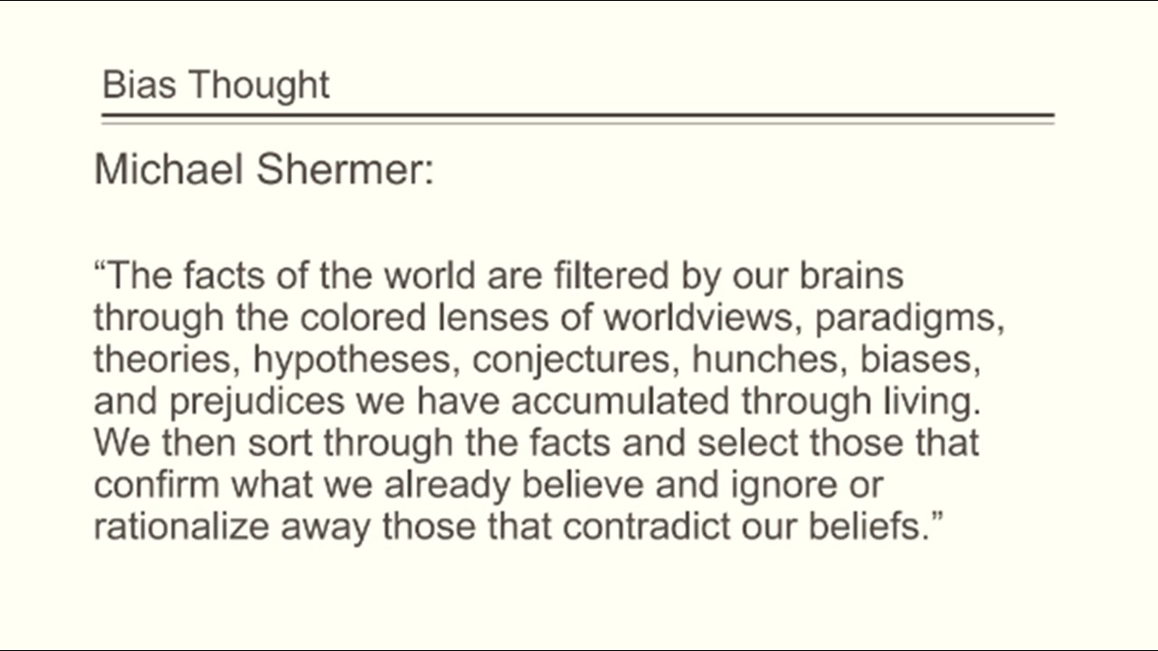 “The facts of the world,” notes science writer and historian of science Michael Shermer, “are filtered by our brains through the colored lenses of worldviews, paradigms, theories, hypotheses, conjectures, hunches, biases, and prejudices [which] we have accumulated through living. We then sort through the facts and select those that confirm what we already believe and ignore or rationalize away those that contradict our beliefs.”