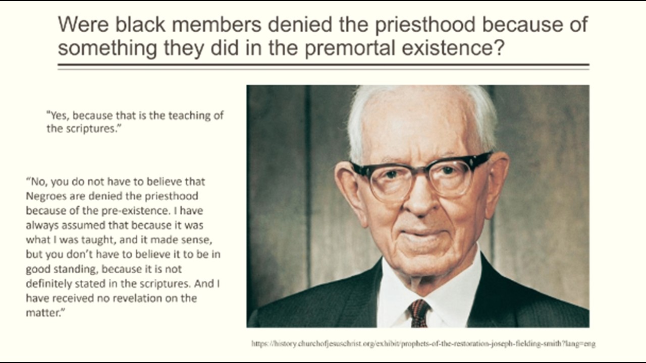 I got an appointment with Joseph Fielding Smith and asked him directly if I must believe in the pre-existence hypothesis to have good Church standing. He replied, ‘Yes, because that is the teaching of the scriptures.’ I asked him to show me the teaching in the scriptures since I had not been able to find it there. President Smith patiently went through the sources with me, particularly the Pearl of Great Price, and then he said something quite remarkable: ‘You do not have to believe that Negroes are denied the priesthood because of the pre-existence. I have always assumed that because it was what I was taught, and it made sense, but you don’t have to believe it to be in good standing, because it is definitely not stated in the scriptures. And I have received no revelation on the matter.’”