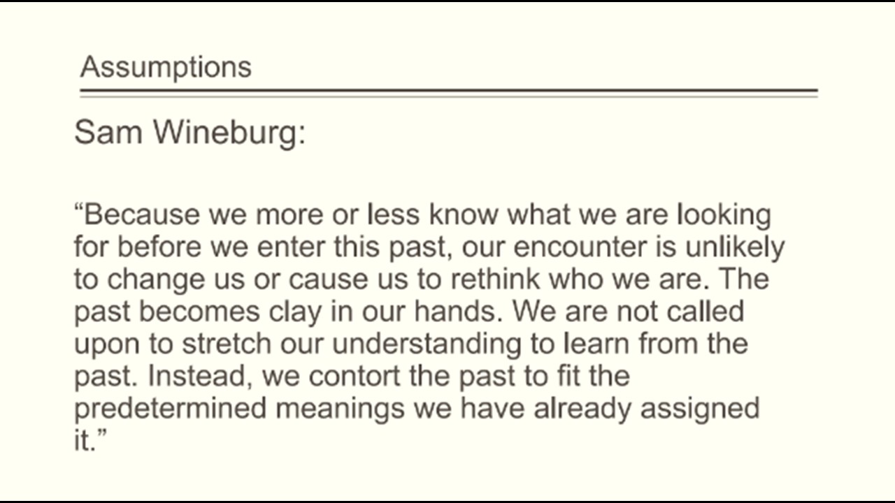 Because we more or less know what we are looking for before we enter this past, our encounter is unlikely to change us or cause us to rethink who we are. The past becomes clay in our hands. We are not called upon to stretch our understanding to learn from the past. Instead, we contort the past to fit the predetermined meanings we have already assigned it.”