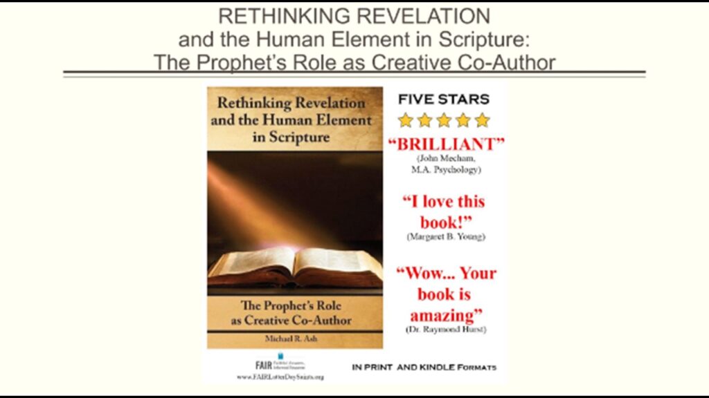 So, to quick- I’m going to put in a shameless plug here to a book that FAIR published of mine a couple of years ago called Rethinking Revelation: The Human Element in Scripture/The Prophet’s Role as Creative Co-Author, ‘cause this ties to this topic that I’ve discussed so far, in how God speaks to all of us, including prophets, through the manner of our own language, and how cultural biases, and opinions, and so forth still affect the language in which revelation is given—it’s the “manner of our language.”