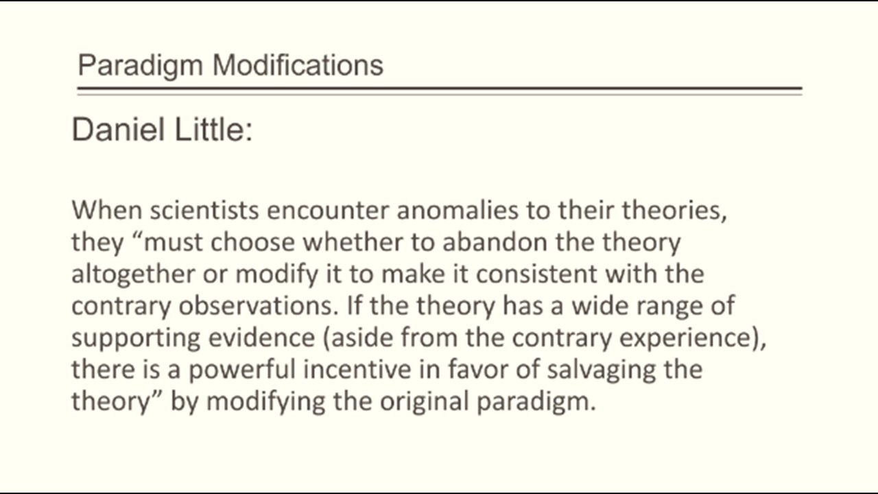 For example, Daniel Little, a philosophy professor and chancellor at the University of Michigan-Dearborn, claims that when scientists encounter anomalies in their theories, they