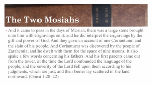 From the book of Mosiah to the first part of 3 Nephi, Mormon told tales of apostates. Some may have completely adopted foreign gods. Some, however, such as the priests of Noah, continued to teach the Law of Moses. The language of the Title Page is so familiar to modern readers that we easily miss the reason that it is such an important part of Mormon’s message. The very first statement is that Jesus is the Christ. In more time-appropriate language, this would be Jesus is the Messiah. That shifts the framing of the concept just a little for a modern reader. This shift is to dramatically reframe.