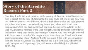 Limhi was anxious to have the record translated, and asked Ammon if there was one who could do so. Ammon declared that there was a seer in Zarahemla. “A man that can translate the records; for he has wherewith that he can look, and translate all records that are of ancient date” (Mosiah 8:13). There are many important stories Mormon told about the people of Zeniff. These include Abinadi before Noah and Alma1’s conversion and creation of a church. However, before telling those stories, Mormon introduced the Jaredite record and Mosiah2 as the translator.[16] Mormon never told any story without a reason. Mormon did not haphazardly stop right at the point where he introduced both the book of Ether and established the second part of the thematic parallel between Mosiah1 and Mosiah2.