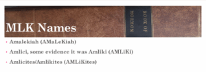 The name we have as Amlici may actually have been intended as Amliki. Making it an MLK name. Royal Skousen notes that the original is not extant at this point. In the printer’s manuscript the name of the person appears to be consistently spelled Amlici. However: “On the other hand, the first two occurrences in [the printer’s manuscript] of Amlicites (in Alma 2:11–12) are spelled Amlikites.[22] There is some confusion about peoples named Amalekites and Amlicites in the Book of Mormon. A plausible reason for the confusion is that Mormon used the same MLK name to describe different groups.[23] Mormon cared that they were dissenters. He cared less about the specific details.