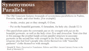 One type of poetic form was two lines with parallel meanings. Donald W. Parry explains and provides examples of literary parallelisms: