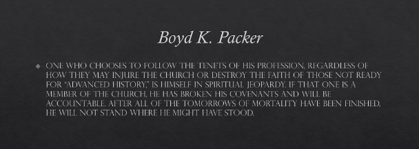 One who chooses to follow the tenets of his profession, regardless of how they may injure the Church or destroy the faith of those not ready for “advanced history,” is himself in spiritual jeopardy. If that one is a member of the Church, he has broken his covenants and will be accountable. After all of the tomorrows of mortality have been finished, he will not stand where he might have stood.[13]