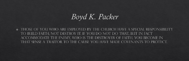 Those of you who are employed by the Church have a special responsibility to build faith, not destroy it. If you accommodate the enemy, who is the destroyer of faith, you become in that sense a traitor to the cause you have made covenants to protect.[14]