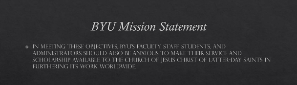 According to the Mission Statement it is incumbent upon all administration, faculty, staff, and students to use their scholarship in furthering the work of The Church of Jesus Christ of Latter-day Saints. It should be available to build and defend the Kingdom of God. This is the one requirement of the BYU Mission Statement that is explicitly shared by “BYU’s faculty, staff, students, and administrators.”