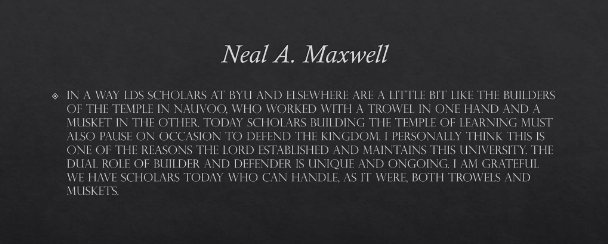 In a way LDS scholars at BYU and elsewhere are a little bit like the builders of the temple in Nauvoo. They worked with a trowel in one hand and a musket in the other. Today scholars building the temple of learning must also pause on occasion to defend the kingdom. I personally think this is one of the reasons the Lord established and maintains this university. The dual role of builder and defender is unique and ongoing. I am grateful we have scholars today who can handle, as it were, both trowels and muskets.[18]