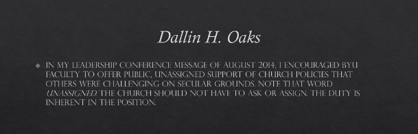 In my leadership conference message of August 2014, I encouraged BYU faculty to offer public, unassigned support of Church policies that others were challenging on secular grounds. Note that word unassigned. The Church should not have to ask or assign. The duty is inherent in the position.[21]