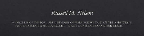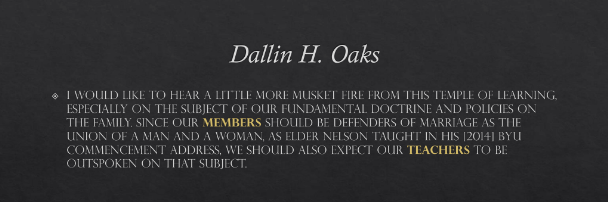I would like to hear a little more musket fire from this temple of learning. Especially on the subject of our fundamental doctrine and policies on the family. Since our members should be defenders of marriage as the union of a man and a woman, as Elder Nelson taught in his [2014] BYU commencement address, we should also expect our teachers to be outspoken on that subject.[22]