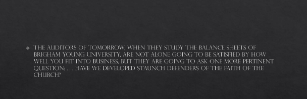 The auditors of tomorrow, when they study the balance sheets of Brigham Young University, are not alone going to be satisfied by how well you fit into business, but they are going to ask one more pertinent question: . . . have we developed staunch defenders of the faith of the Church?”[24]
