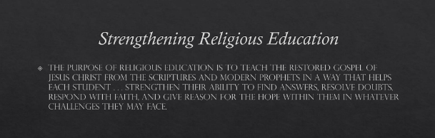 is to teach the restored gospel of Jesus Christ from the scriptures and modern prophets in a way that helps each student . . . strengthen their ability to find answers, resolve doubts, respond with faith, and give reason for the hope within them in whatever challenges they may face.”[25]