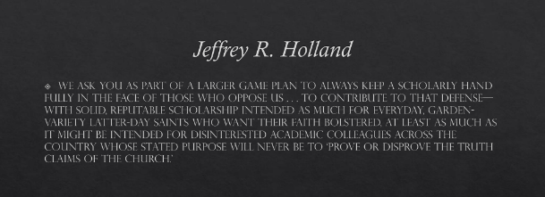 He said that the Brethren want those at Brigham Young University “to contribute to that defense—with solid, reputable scholarship intended as much for everyday, garden-variety Latter-day Saints who want their faith bolstered, at least as much as it might be intended for disinterested academic colleagues across the country whose stated purpose will never be to ‘prove or disprove the truth claims of the Church.’”[28]
