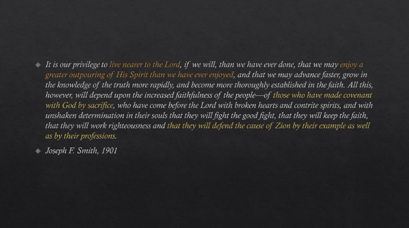 I would like to explore the idea expressed by President Joseph F. Smith in 1901 that “those who have made a covenant with God by sacrifice . . . will defend the cause of Zion.”[1] President Smith called doing so a “privilege.” He promised that those who defended the cause of Zion would “enjoy a greater outpouring of [the Lord’s] Spirit than we have ever enjoyed.” That they would “live nearer to the Lord.”[2] For Latter-day Saints, both of those blessings are desirable. They know that “when we obtain any blessing from God, it is by obedience to that law upon which it is predicated.”[3]