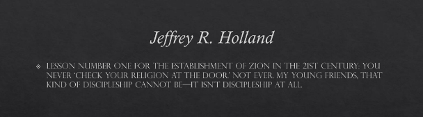 Lesson number one for the establishment of Zion in the 21st century: You never ‘check your religion at the door.’ Not ever. My young friends, that kind of discipleship cannot be—it isn’t discipleship at all.[38]