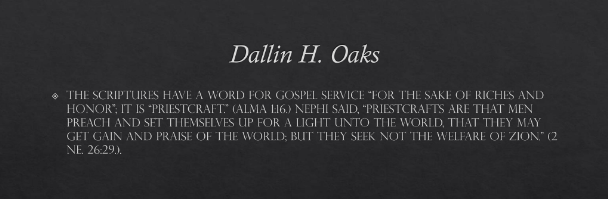The scriptures have a word for gospel service “for the sake of riches and honor”; it is “priestcraft.” (Alma 1:16.) Nephi said, “Priestcrafts are that men preach and set themselves up for a light unto the world, that they may get gain and praise of the world; but they seek not the welfare of Zion.” (2 Ne. 26:29.).[44]