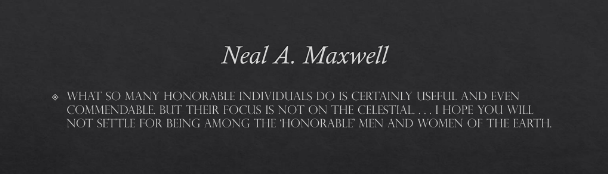 what so many honorable individuals do is certainly useful and even commendable. But their focus is not on the celestial. . . . I hope you will not settle for being among the ‘honorable’ men and women of the earth.”[46]