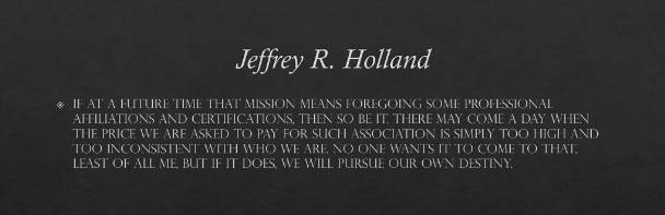 If at a future time that mission means foregoing some professional affiliations and certifications, then so be it. There may come a day when the price we are asked to pay for such association is simply too high and too inconsistent with who we are. No one wants it to come to that, least of all me, but if it does, we will pursue our own destiny.”[49]