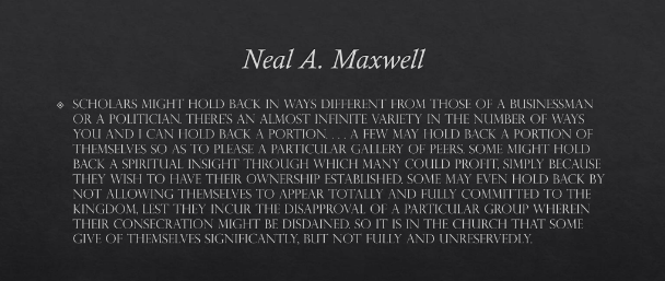 The sacrifice required to keep the covenant of defending the Kingdom is a form of consecration. Elder Neal A. Maxwell discussed the purpose of consecration as pertaining both to scholarship and scholarship in the context of defending the faith: