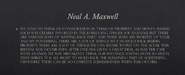 There are a lot of things we can hold back besides property. There are a lot of things we can refuse to put on the altar. This refusal may occur even after one has given a great deal, as was the case with Ananias. We may mistakenly think having done so much, that surely it is all right to hold back the remaining part of something. Obviously there can be no complete submissiveness when this occurs.”