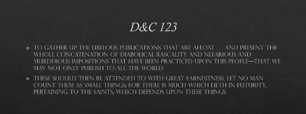 The early Latter-day Saints saw it as a duty to defend themselves through the press.[5] Early Saints wrote and published things that defended their beliefs. They had scriptural precedent for that, for they have been commanded: