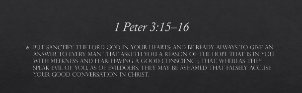 But sanctify the Lord God in your hearts: and be ready always to give an answer to every man that asketh you a reason of the hope that is in you with meekness and fear: Having a good conscience; that, whereas they speak evil of you, as of evildoers, they may be ashamed that falsely accuse your good conversation in Christ.” (1 Peter 3:15–16)