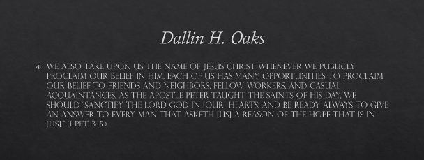 We also take upon us the name of Jesus Christ whenever we publicly proclaim our belief in him. Each of us has many opportunities to proclaim our belief to friends and neighbors, fellow workers, and casual acquaintances.