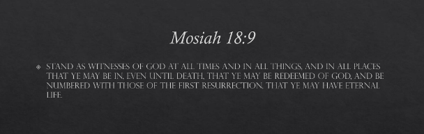 to stand as witnesses of God at all times and in all things, and in all places that ye may be in, even until death, that ye may be redeemed of God, and be numbered with those of the first resurrection, that ye may have eternal life” (Mosiah 18:9).