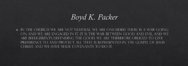 In the Church we are not neutral. We are one-sided. There is a war going on, and we are engaged in it. It is the war between good and evil, and we are belligerents defending the good. We are therefore obliged to give preference to and protect all that is represented in the gospel of Jesus Christ. And we have made covenants to do it.[11]