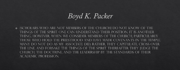 [Scholars who are not members of the Church] do not know of the things of the Spirit. One can understand their position. It is another thing, however, when we consider members of the Church, particularly those who hold the priesthood and have made covenants in the temple. Many do not do as my associate did. Rather, they capitulate, cross over the line, and forsake the things of the Spirit. Thereafter they judge the Church, the doctrine, and the leadership by the standards of their academic profession.[12]