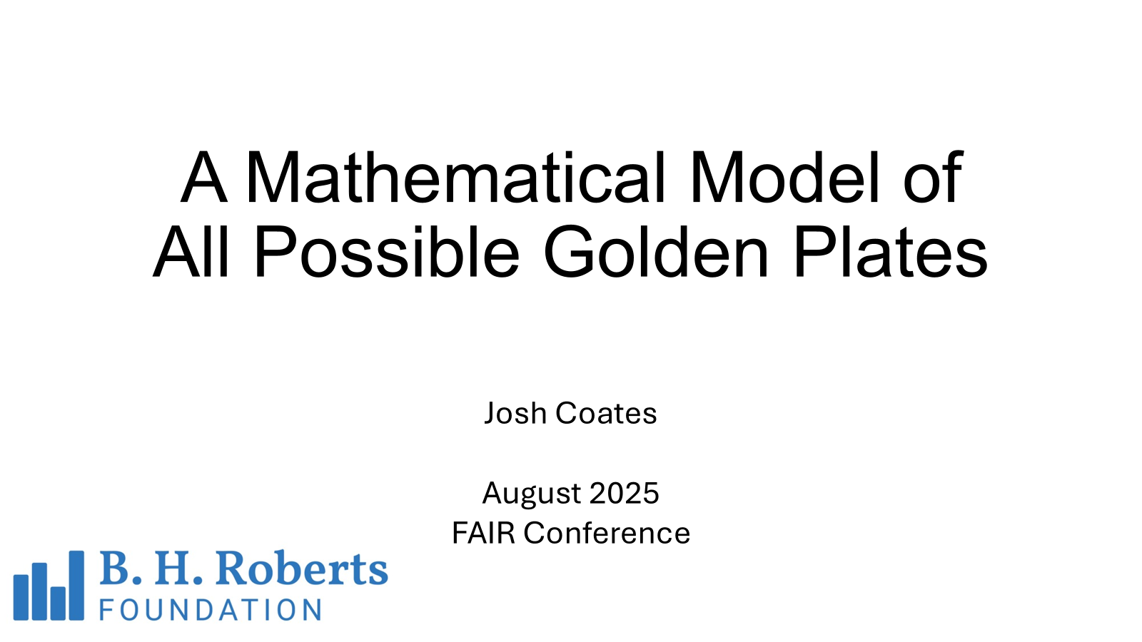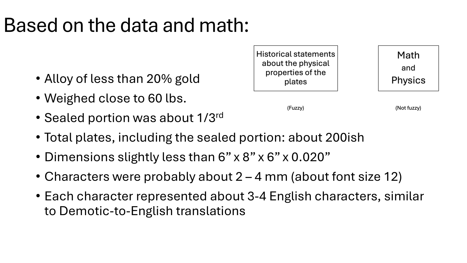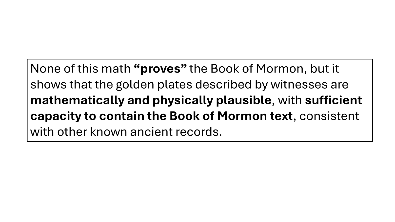 So in conclusion, none of this math proves the Book of Mormon, but it shows that the golden plates described by witnesses are mathematically and physically plausible, with sufficient capacity to contain the Book of Mormon text consistent with other known ancient records.