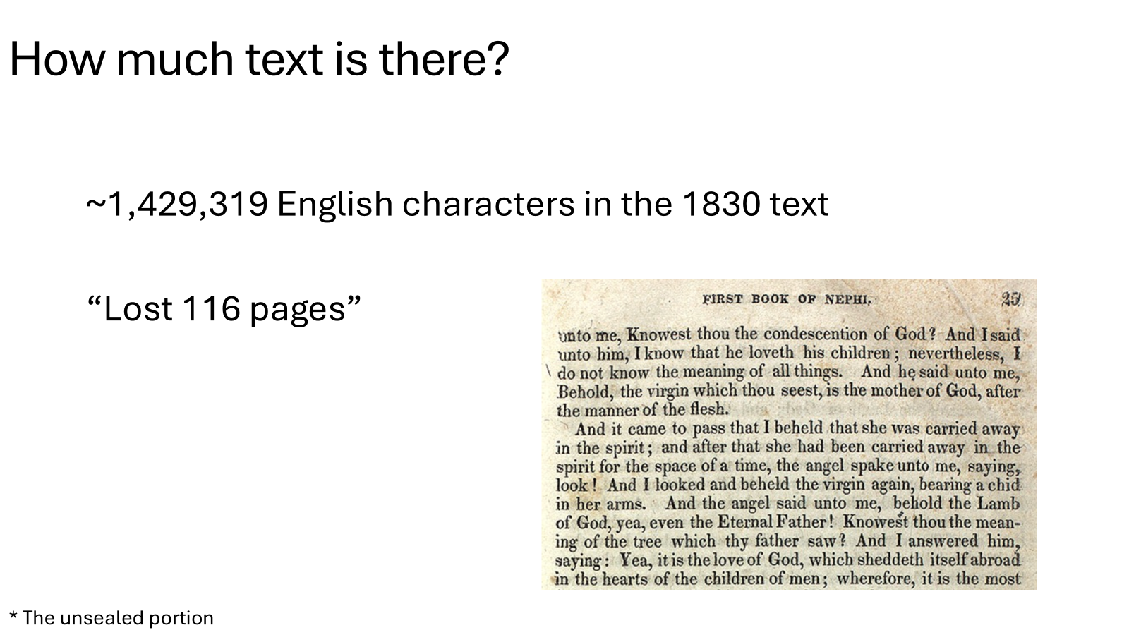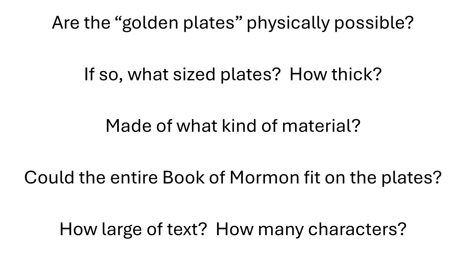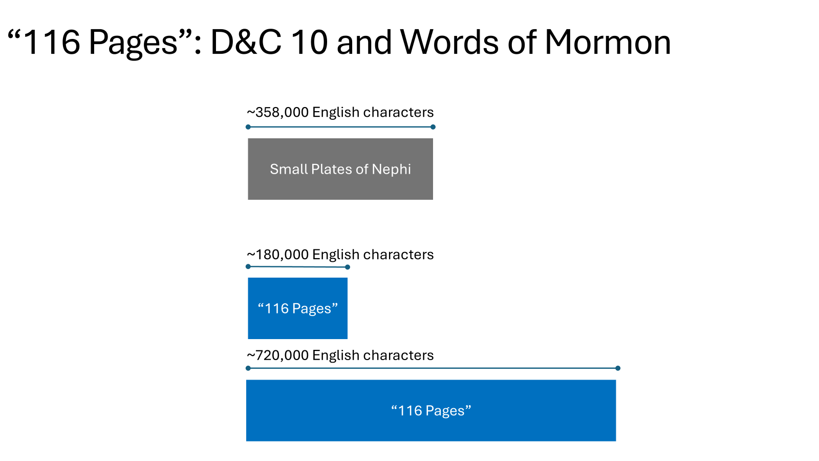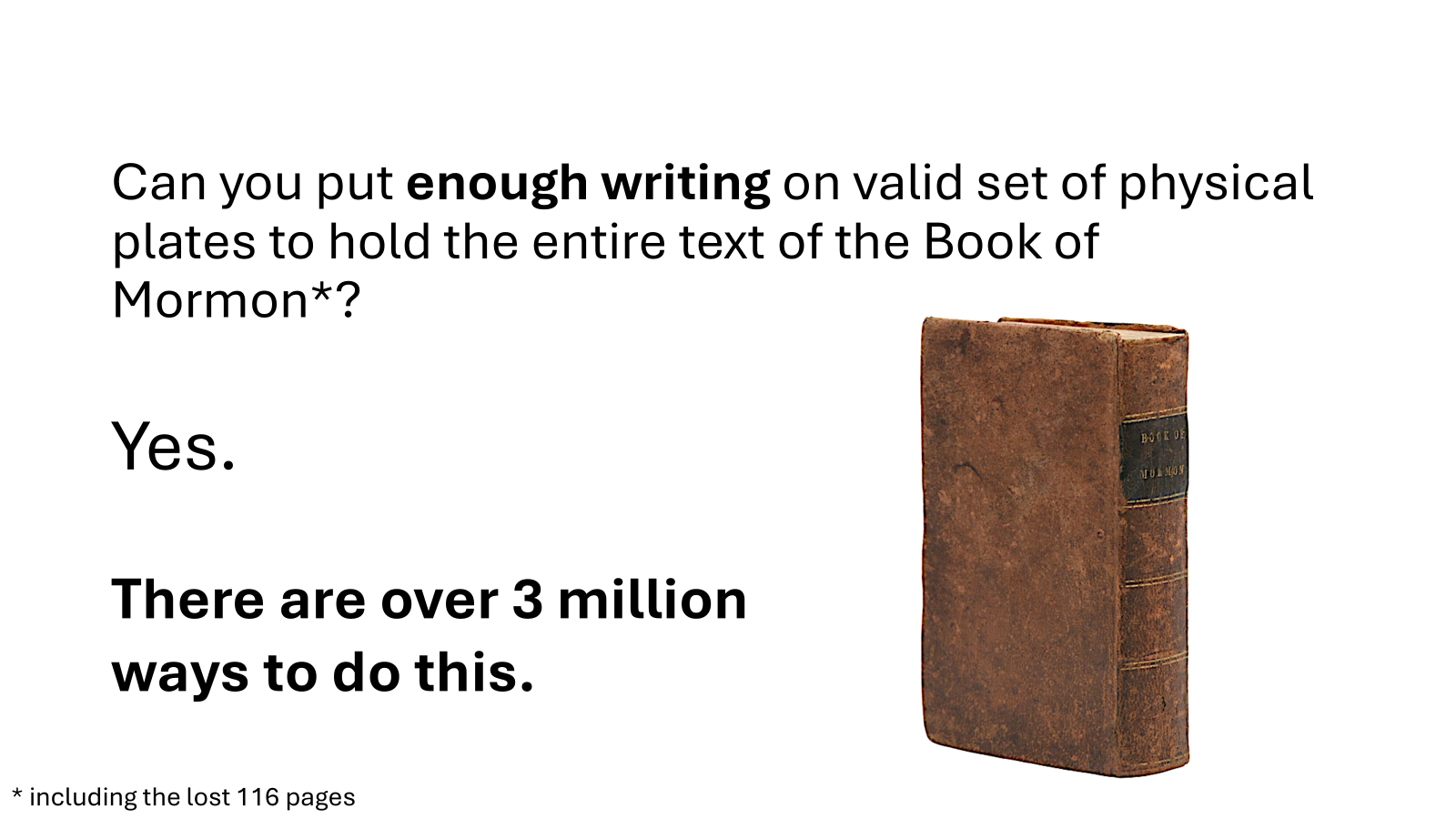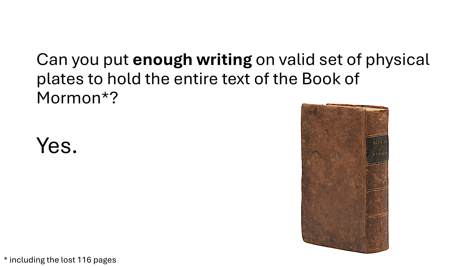 Next, can you put enough writing on the valid set of physical plates to hold the entire text of the Book of Mormon? Notice the asterisk, including the 116 pages. I’ll talk more about what that means exactly.