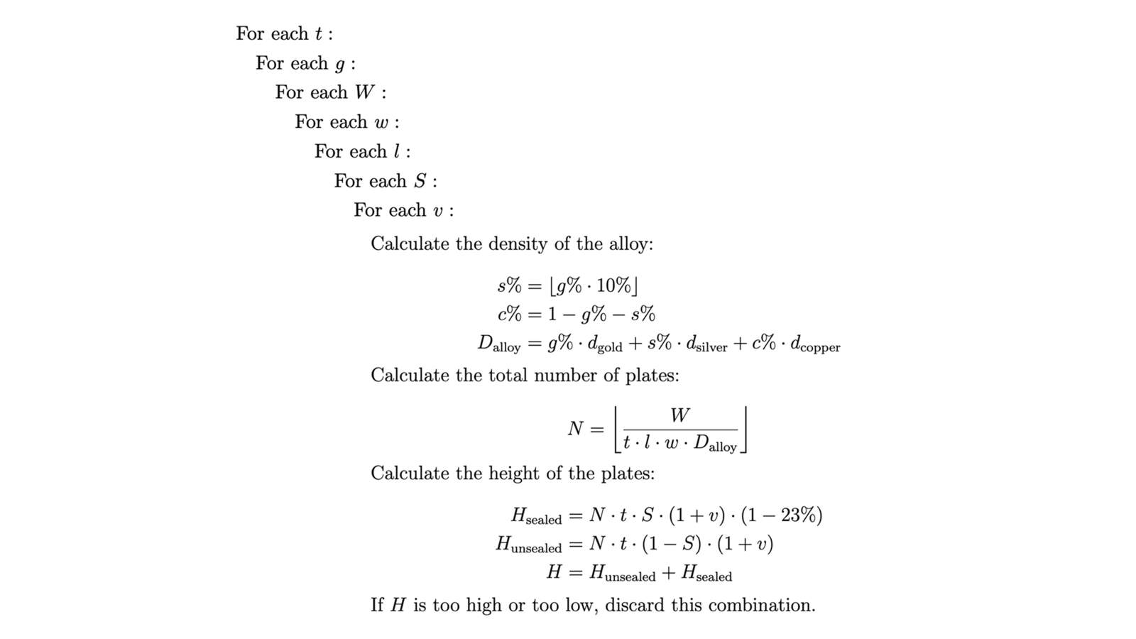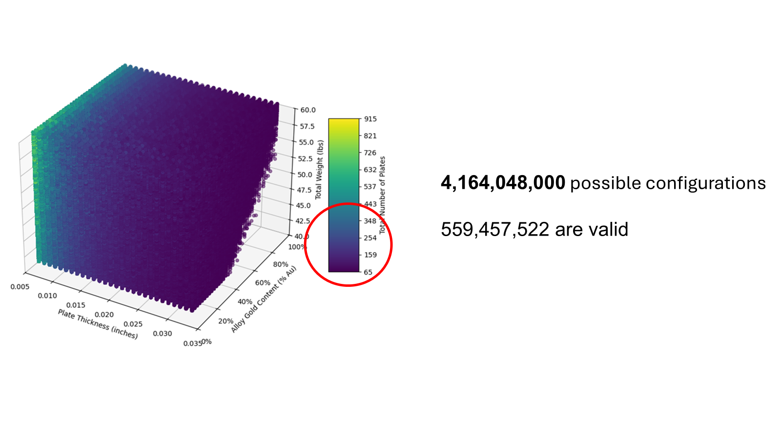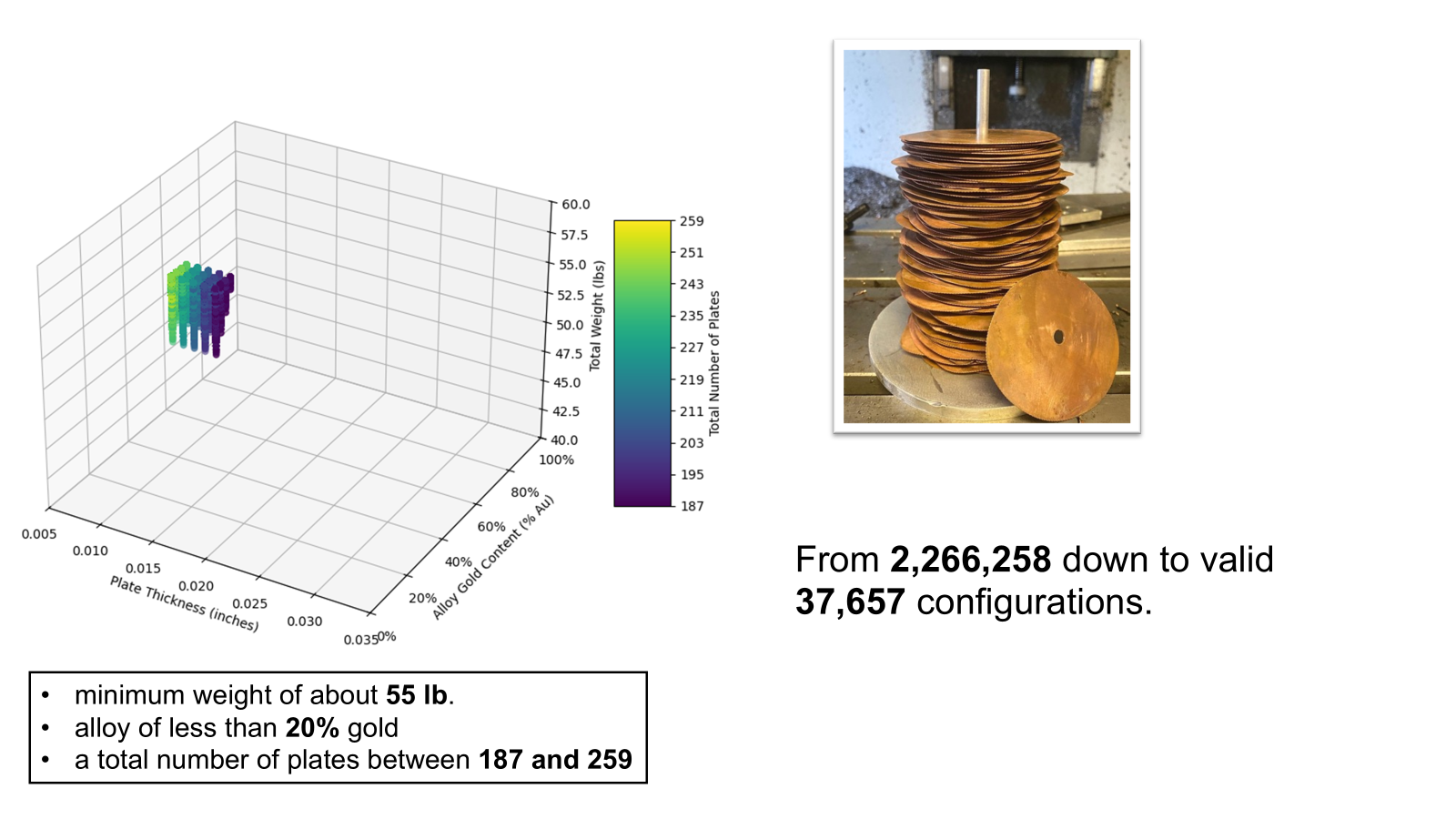 So this time we’re going to say, well, we’re going to change the alloy gold content. Let’s try 15% (gold), 80% copper, 5% silver. And then let’s say it weighs 60 pounds. We just try a couple different variables. We do some more math, we end up with… ‘oh my gosh, this works!’