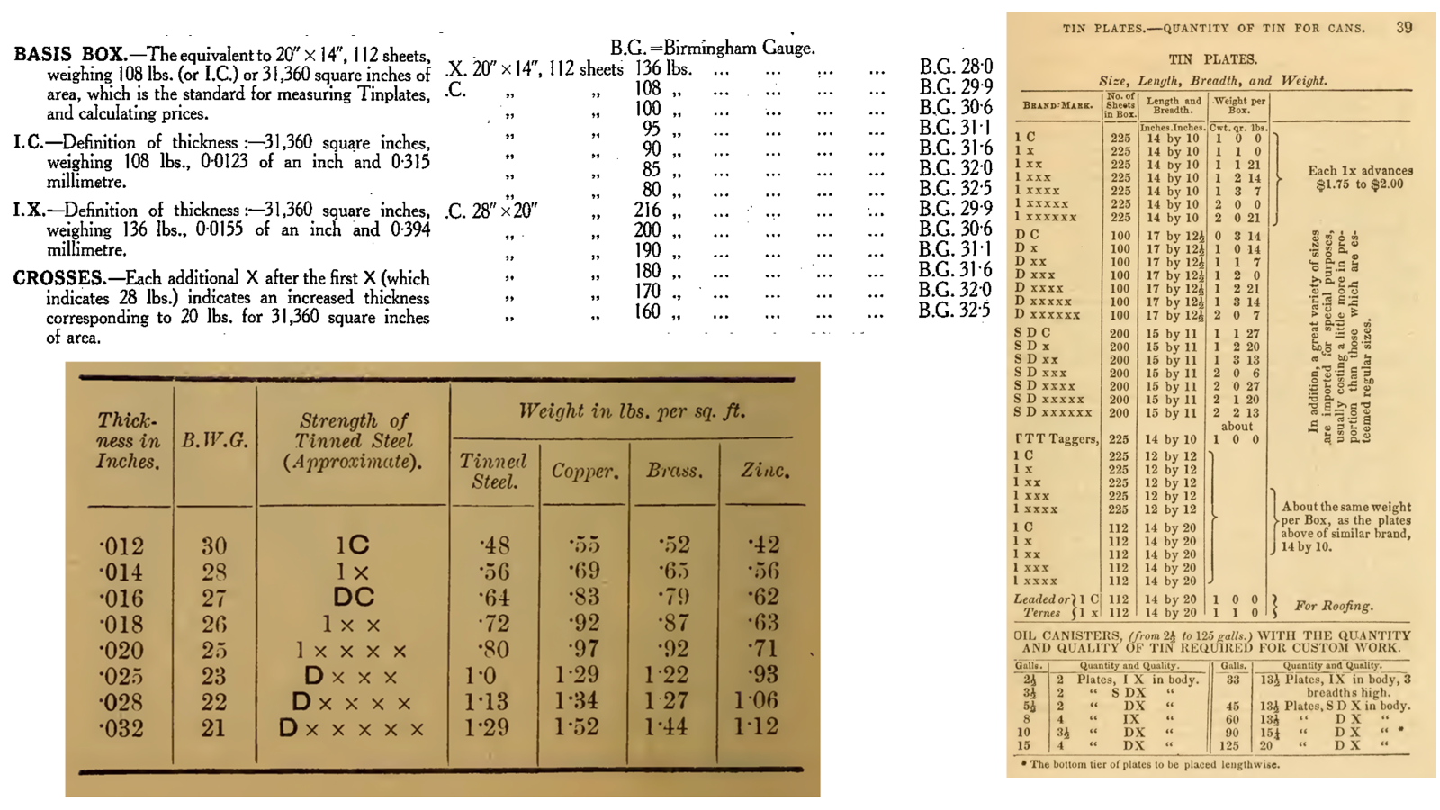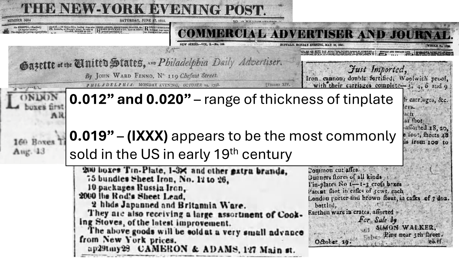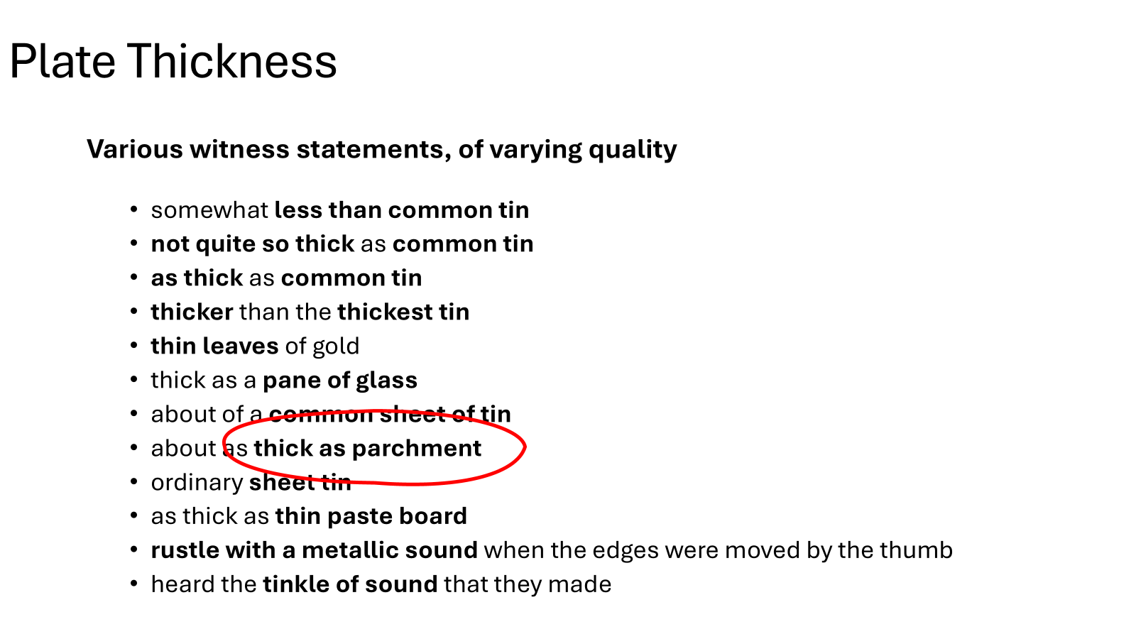 Here are some examples of plate thickness. There’s a lot of “tin” statements. We’ll talk about tin in a little bit–less than common tin, thicker than common tin, etc., etc. Thick as parchment. It was probably the thinnest one. So what was parchment in the 19th century?