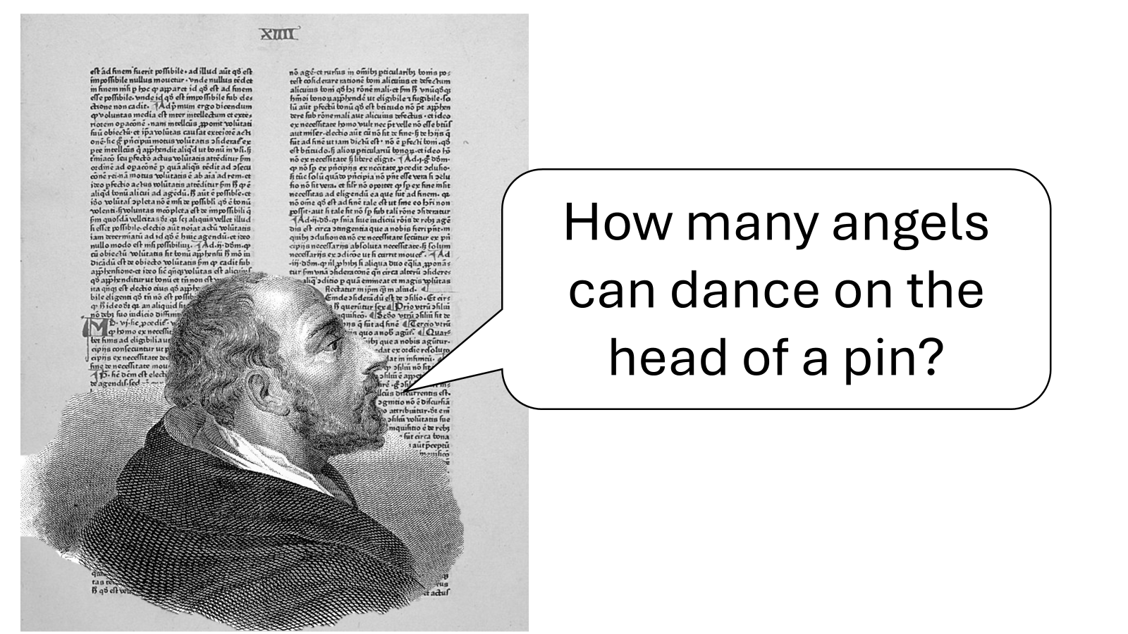 Here’s the thing, though. There’s Thomas Aquinas asking us how many angels can dance on the head of a pin. So none of this stuff actually matters. But, if you can solve some problems, you might as well solve them.