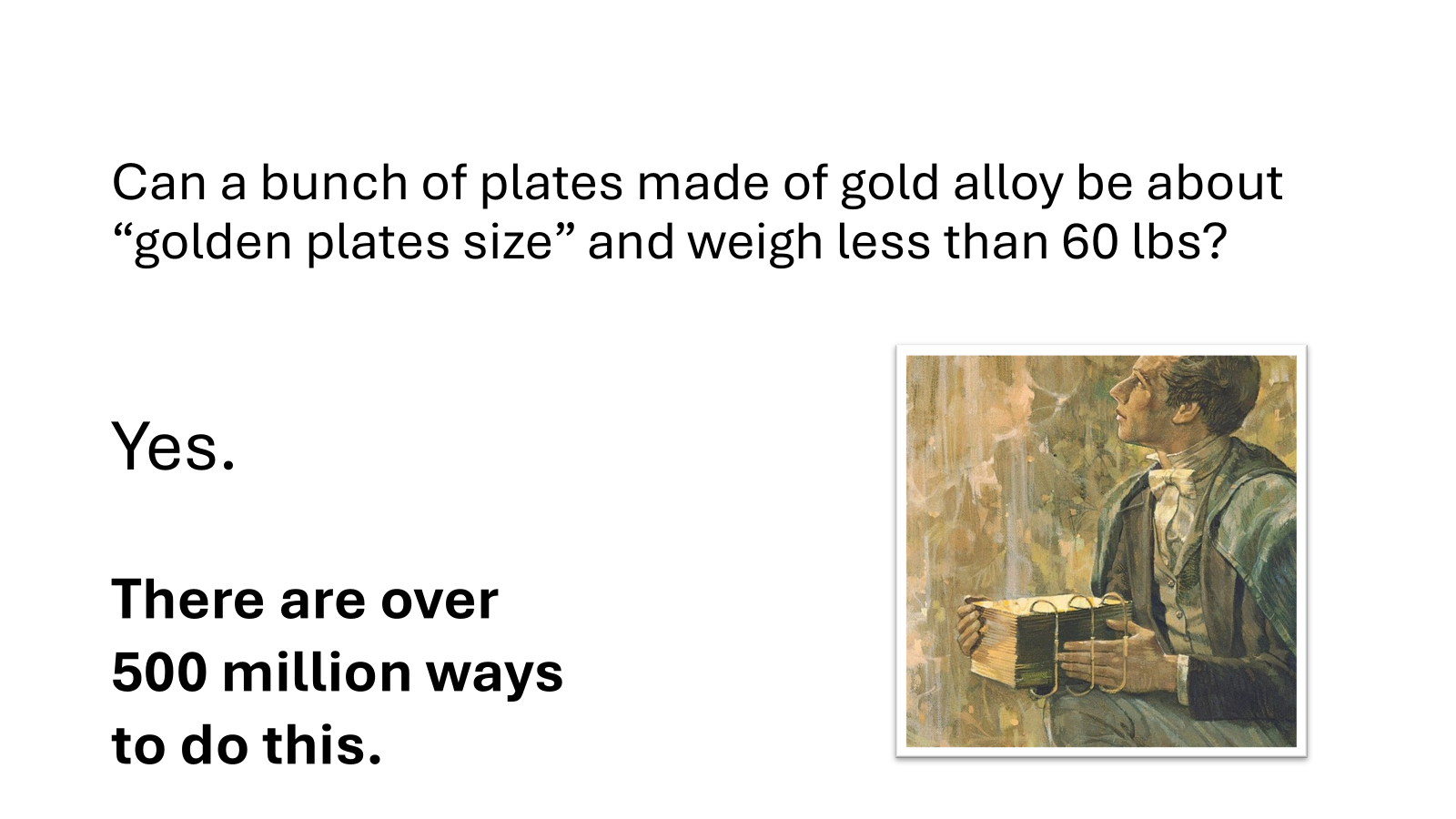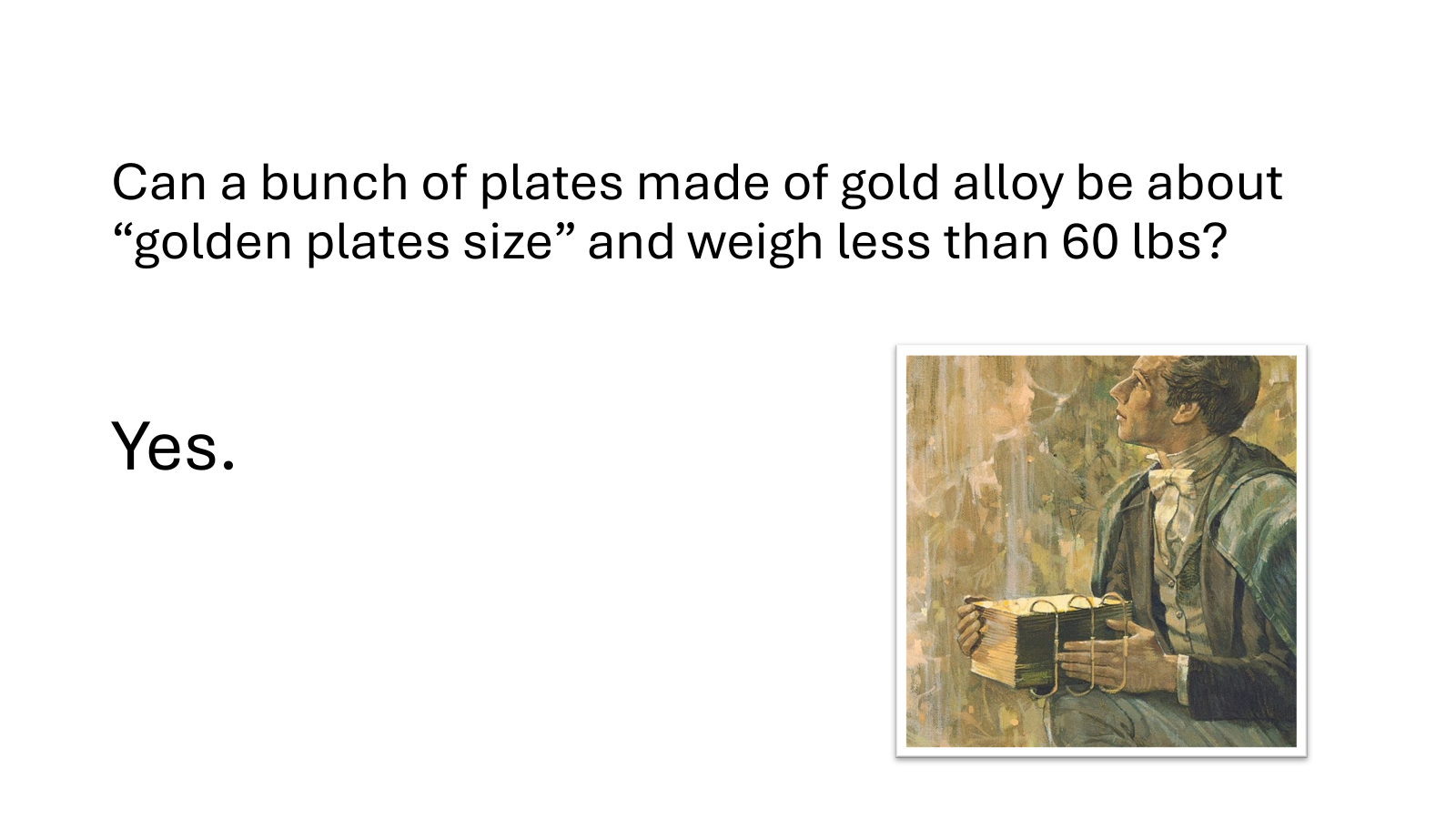 Can a bunch of plates made of gold alloy be about golden-plate-size and weigh less than 60 pounds?