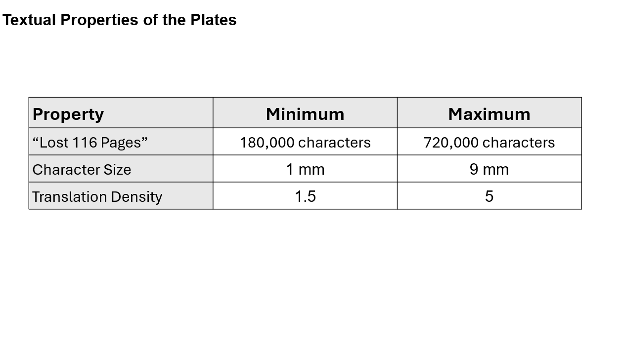 The characters were probably between 2 and 4mm in size, about font size 12. Each character represented about 3 to 4 English characters. So it’s very similar to demotic. The ratio of demotic to translated English. Again, this is just the math. This is how the math works. I’m not reading tea leaves. This is just the math.