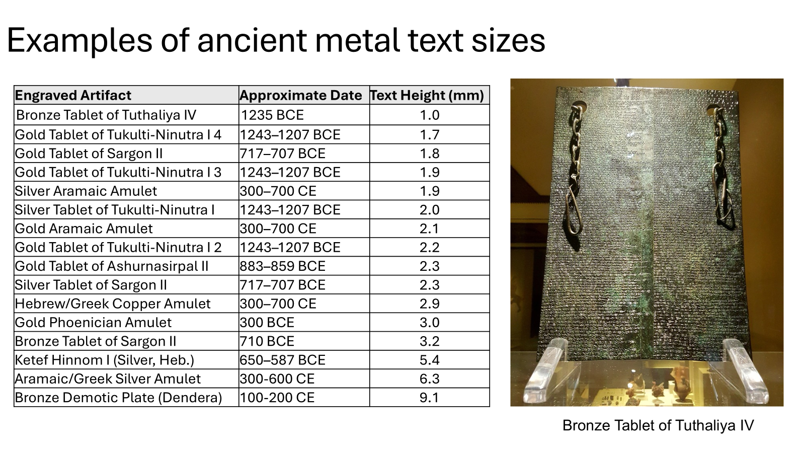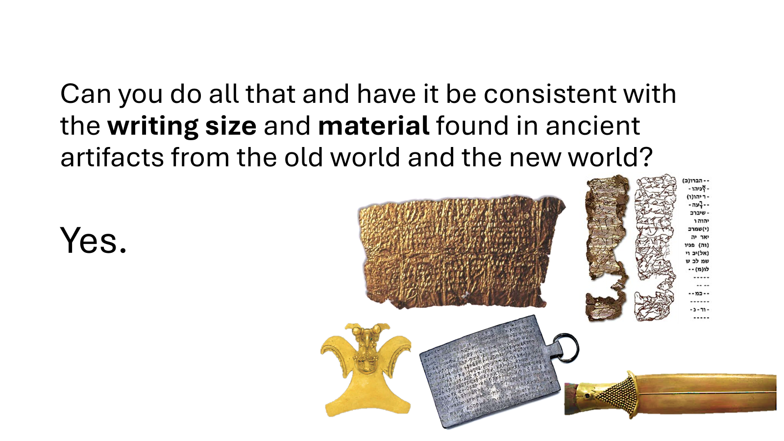 Can you do all of that and have it be consistent with the writing size and material found in ancient artifacts from the Old World and the New World?