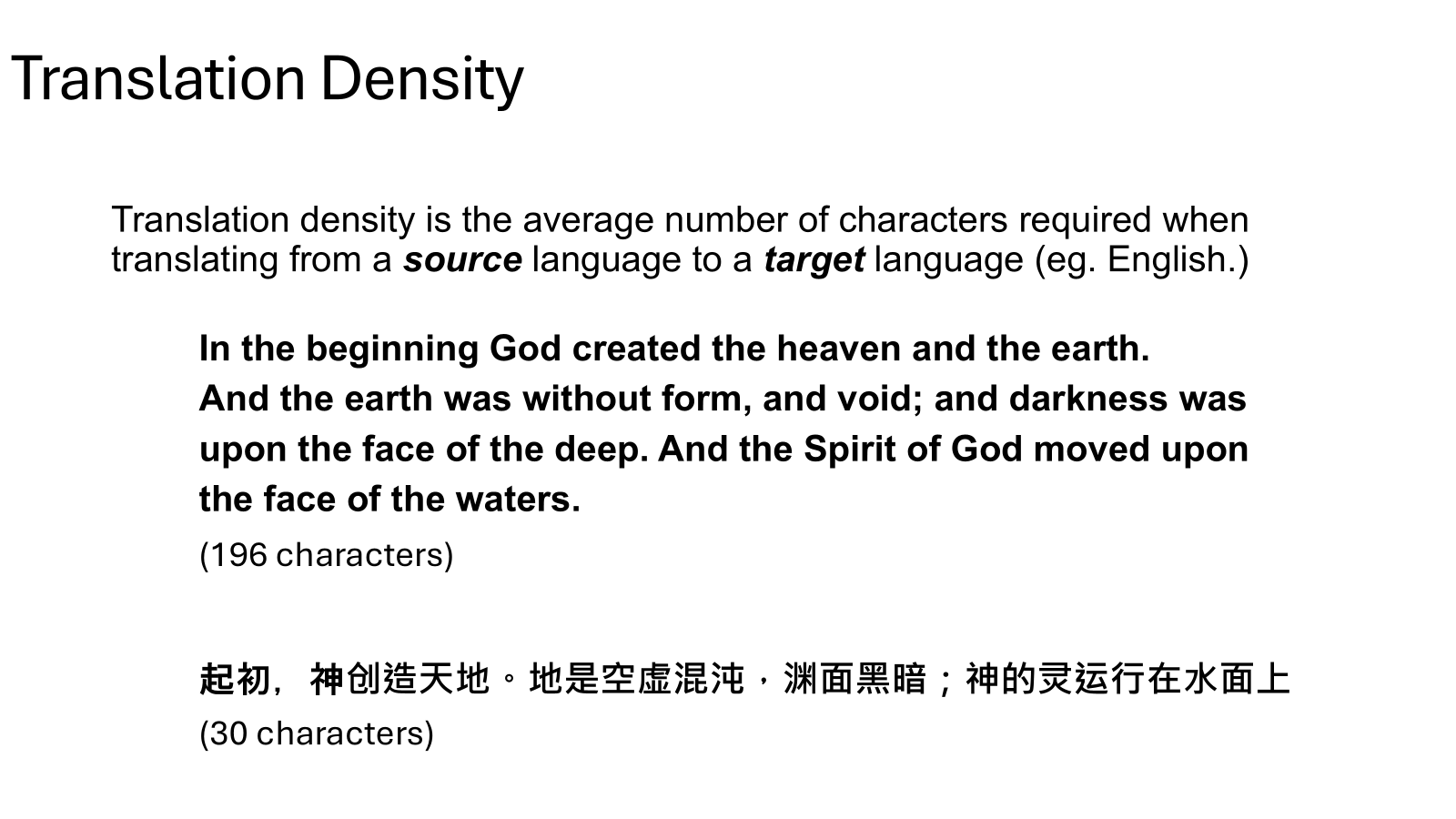 But again, you don’t need to know the language to do this analysis, because I just don’t care what the translation is. I don’t care about how big the words are. I just want to say, how big is this symbol and how many symbols does it take to create an English translation and how many English symbols is that translation?