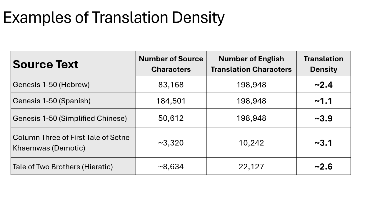 So that’s translation density. So we end up between 1.5 and 5. And what that means is again, we’re trying to figure out how dense is reformed Egyptian. And this is a range.