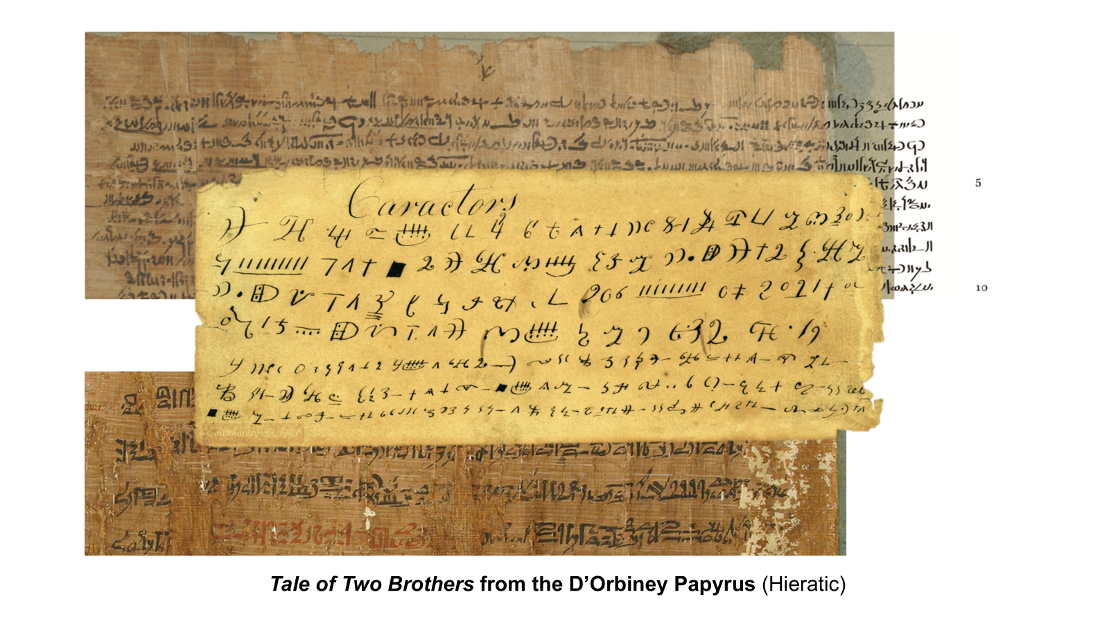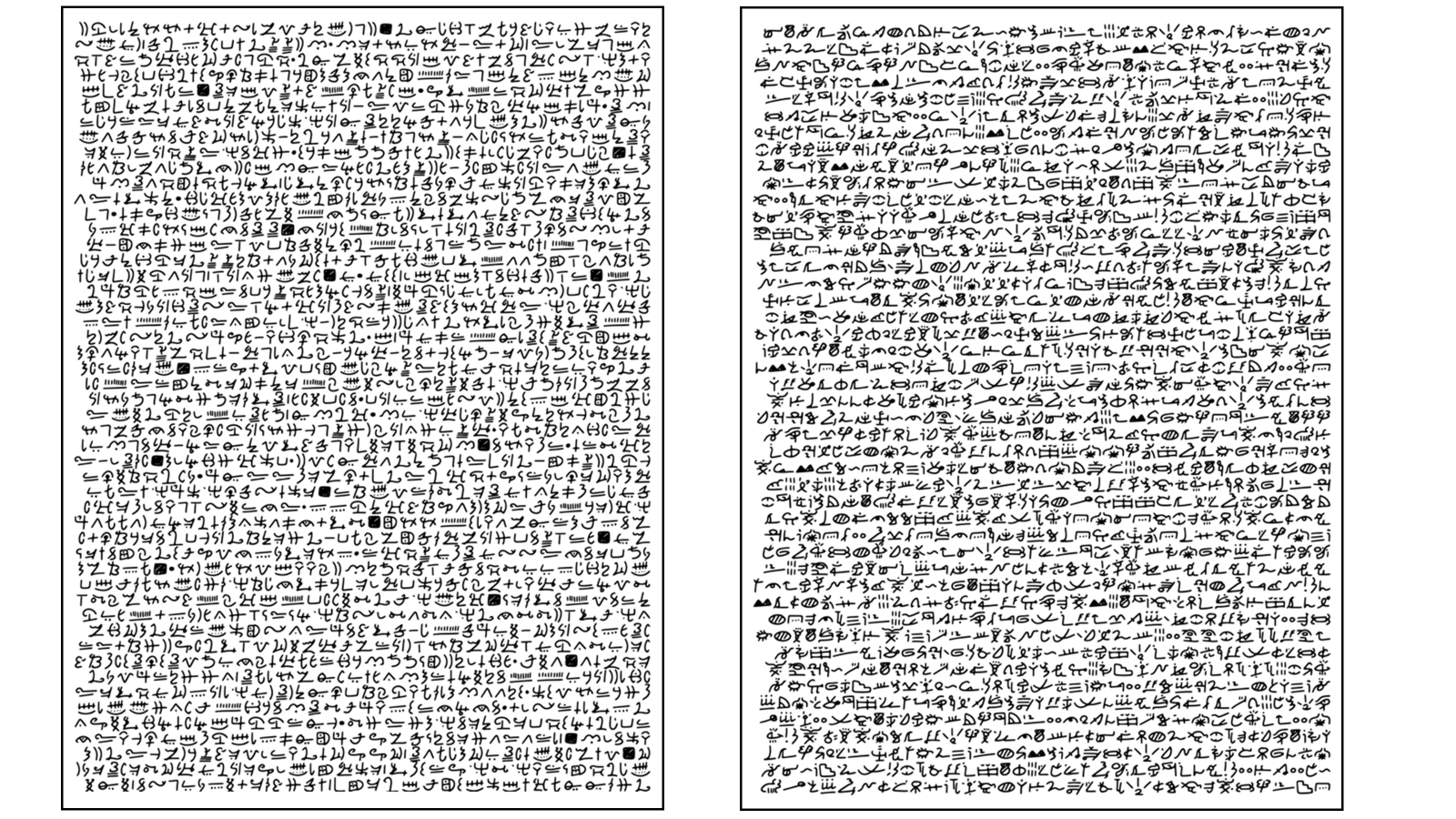 This is an example of what, a roughly six by eight size page, in this size of writing. On the right is hieratic. On the left are actually characters from the characters document. They look a lot alike. Like, I think if you put that in front of someone, they’d be like, I don’t know what’s going on. And if you mixed in demotic, then they get really confused.