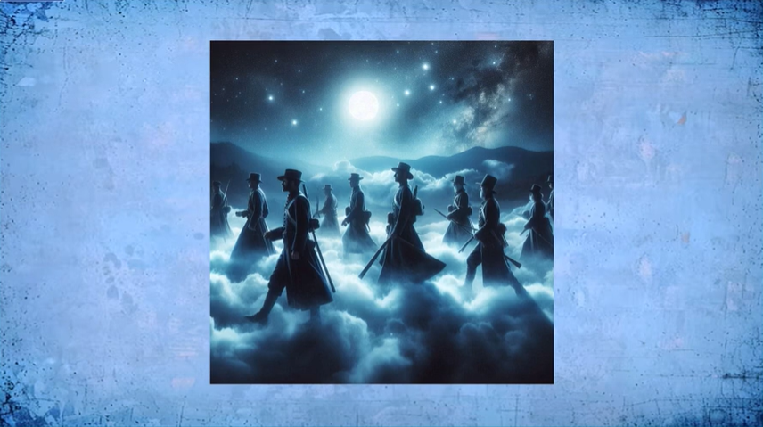 An army battalion, standing twelve men across and arranged in platoons, began to march across the sky until the entire bow was crowded with soldiers. He could see muskets, bayonets, and knapsacks held by the men, and the swords of officers. They wore caps with feathers like those worn by American soldiers in the War of 1812, and he could hear the footsteps and the sound of their equipment jangling as they marched. When they reached the far edge of the horizon, a battle commenced in the sky. Heber, with his family and neighbors, watched this scene for hours. Brigham Young is reported to have witnessed the same event several miles away.