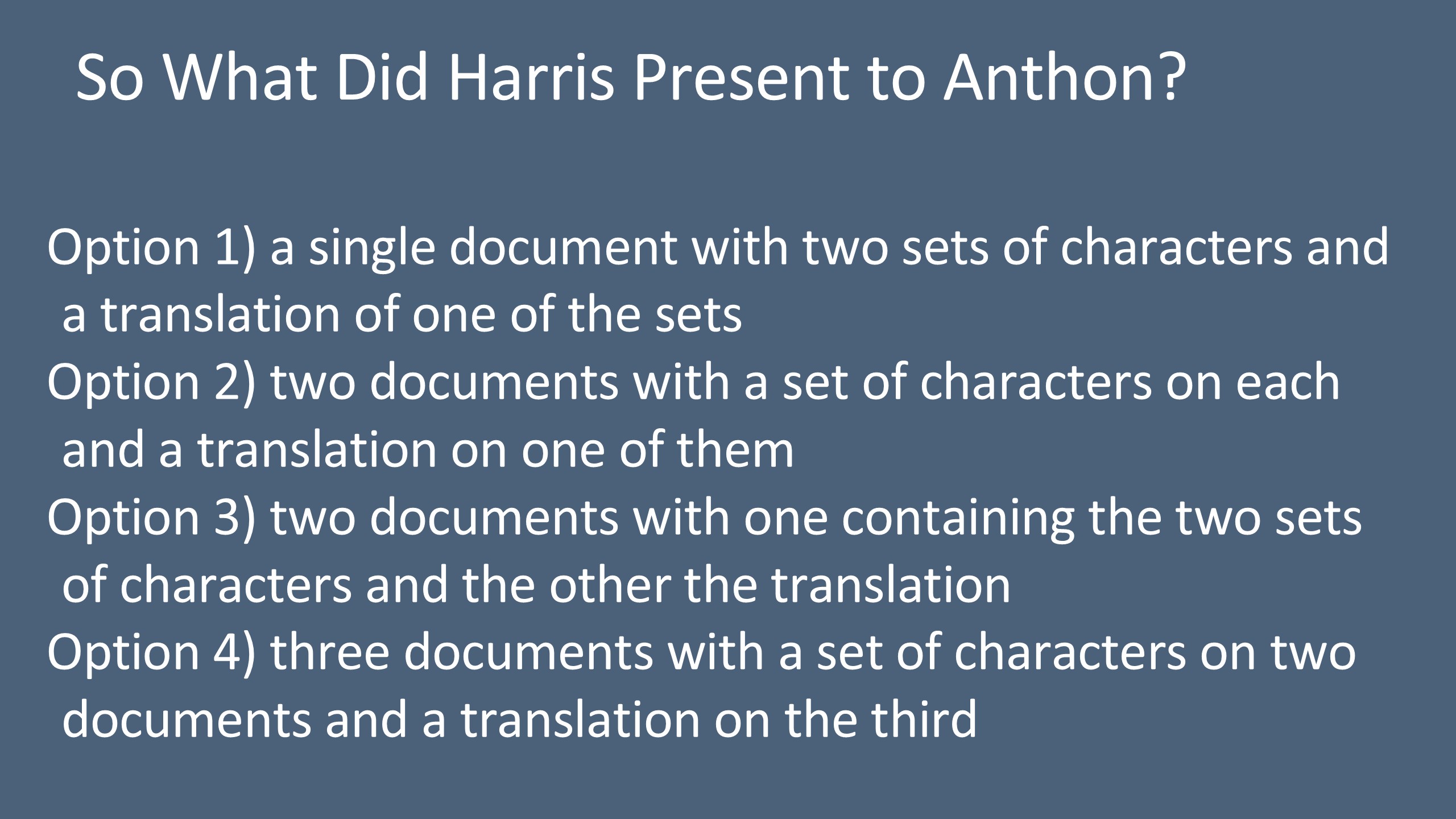 - Option 4) Harris presented three documents with a set of characters on each of two documents and a translation on the third (D1=C1; D2=T of C1; D3=C2)