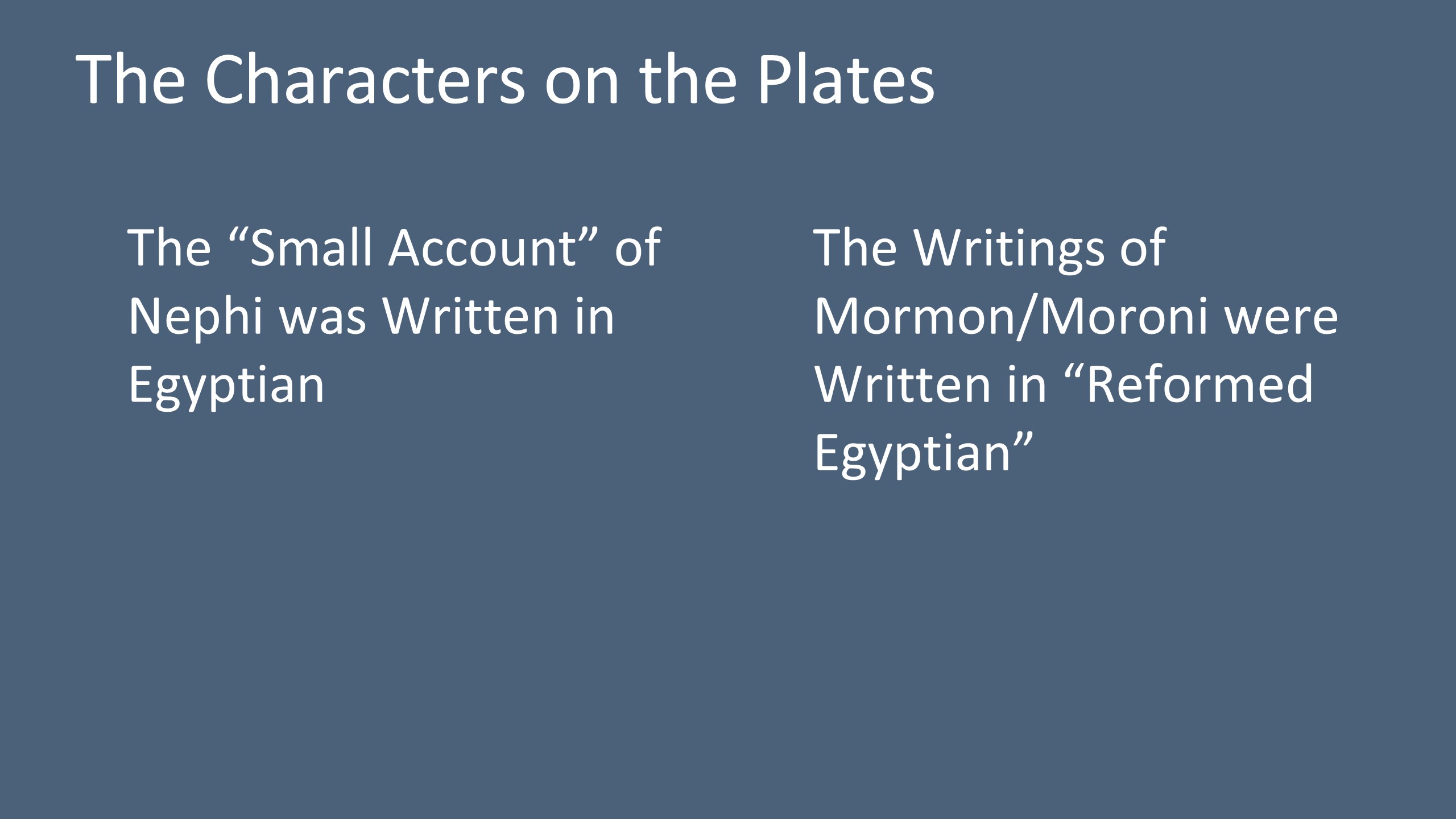 Since Nephi and Jacob lived around a thousand years before Mormon and Moroni, the language and characters on this small record would not have been the altered reformed Egyptian that Mormon and Moroni used.