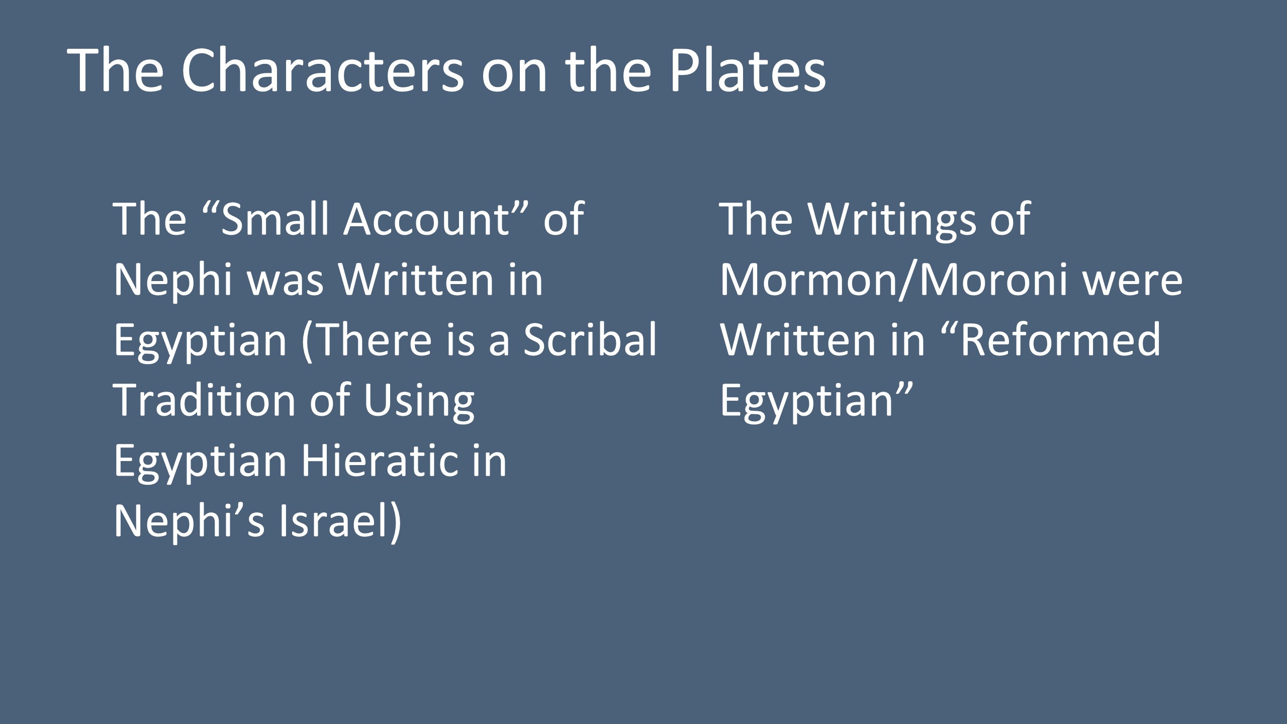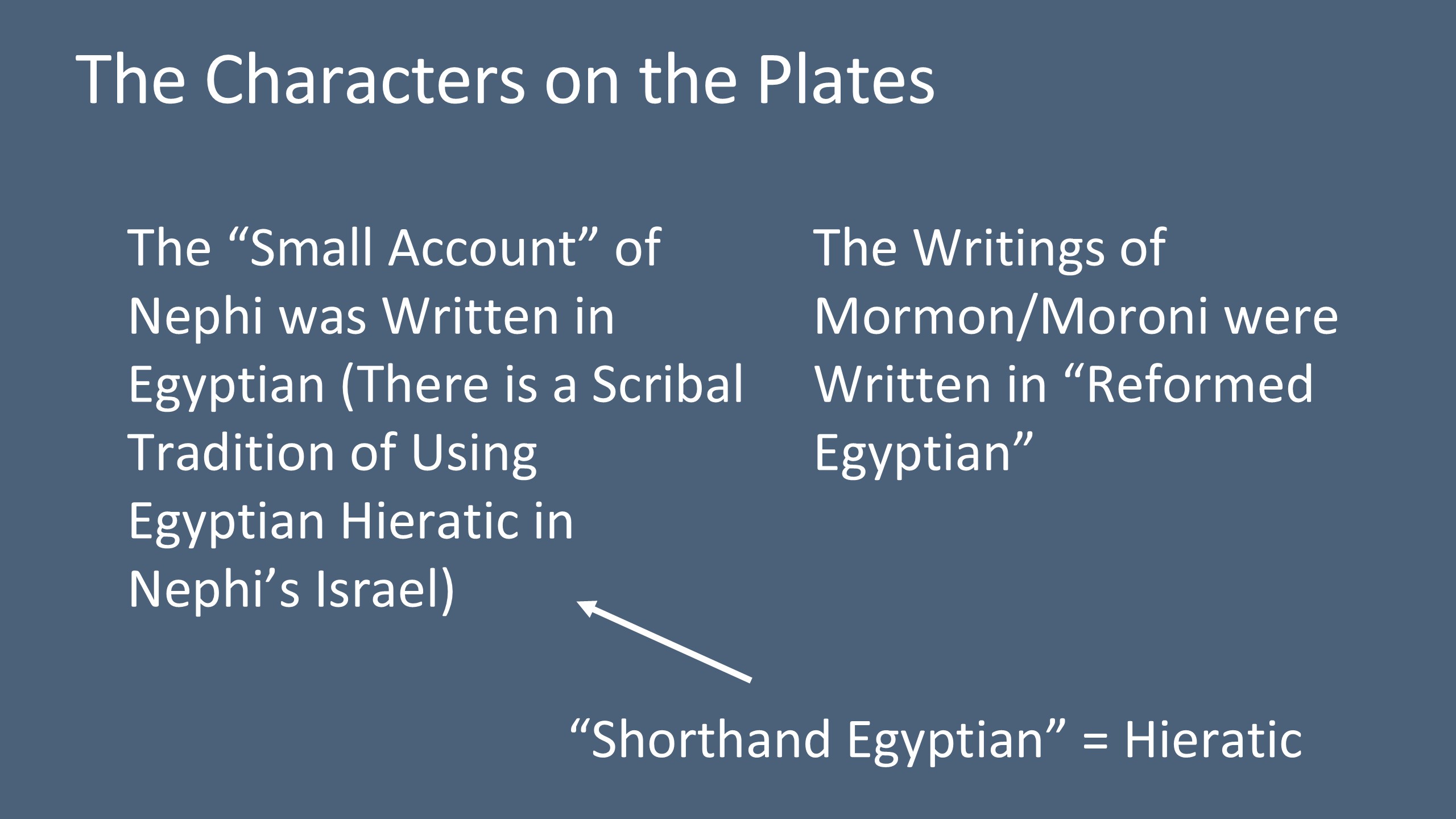 It is known from archaeology that there was a scribal tradition using Egyptian hieratic in Israel during Nephi’s day. This script is the leading candidate for the script Nephi used when making his record. If this additional small account of Nephi, which Mormon placed with the remainder of his abridgment, had been written in the Egyptian language—like hieratic—that was used in Lehi and Nephi’s day, while Mormon and Moroni’s writings, including the title page, were written in reformed Egyptian, then it is reasonable to postulate that two different scripts would have been found on the bundle of plates that Joseph Smith received.
